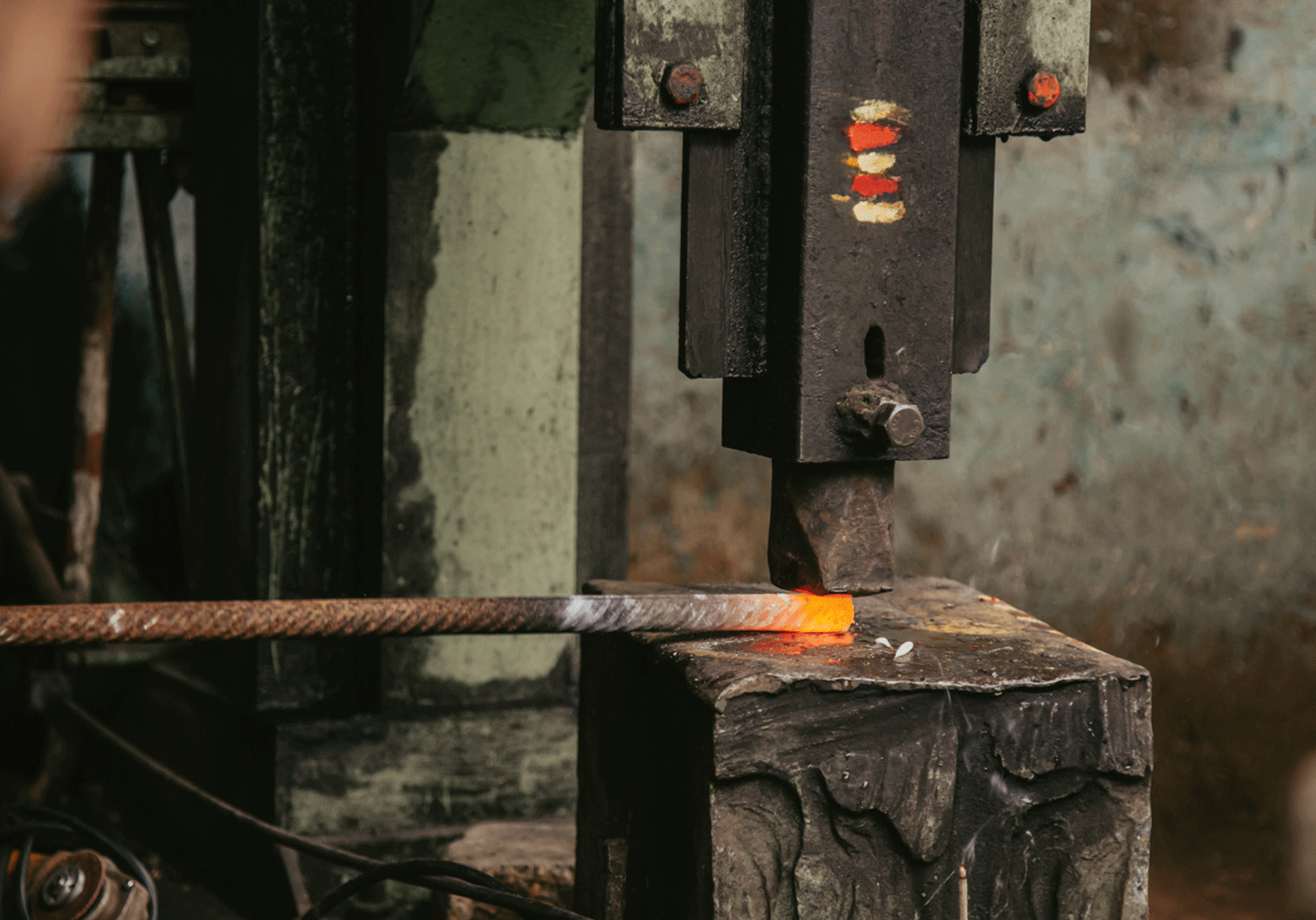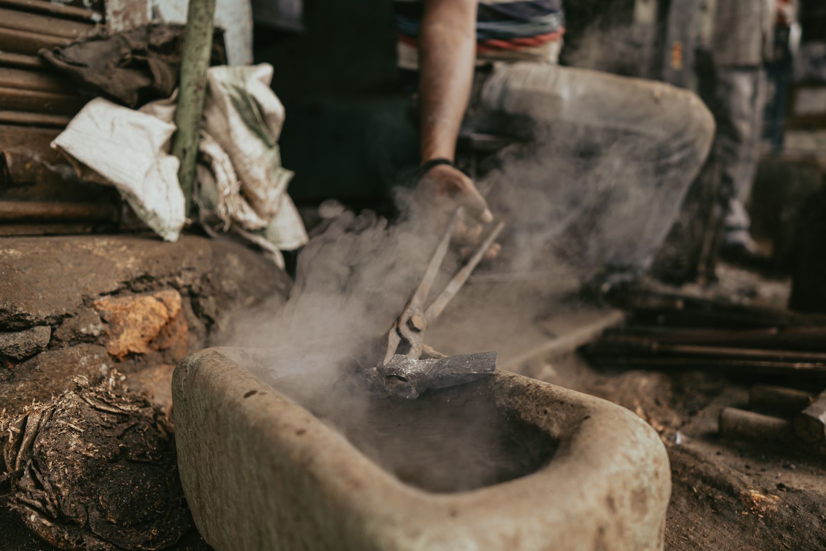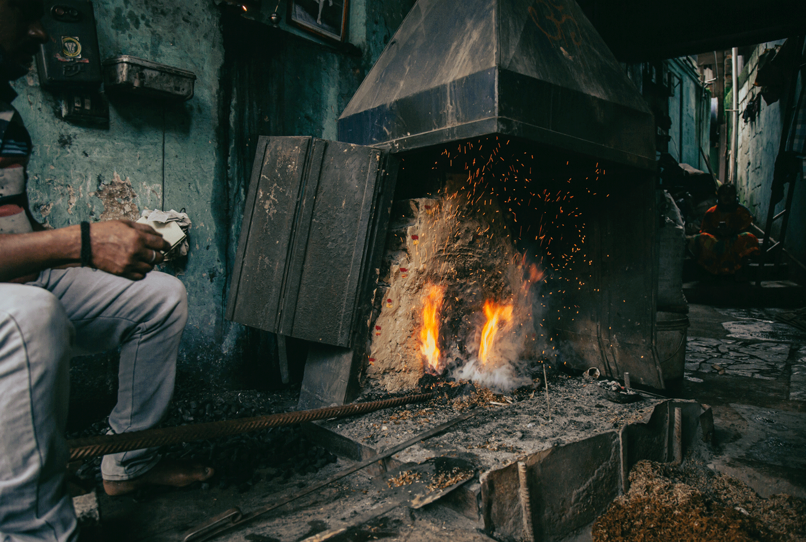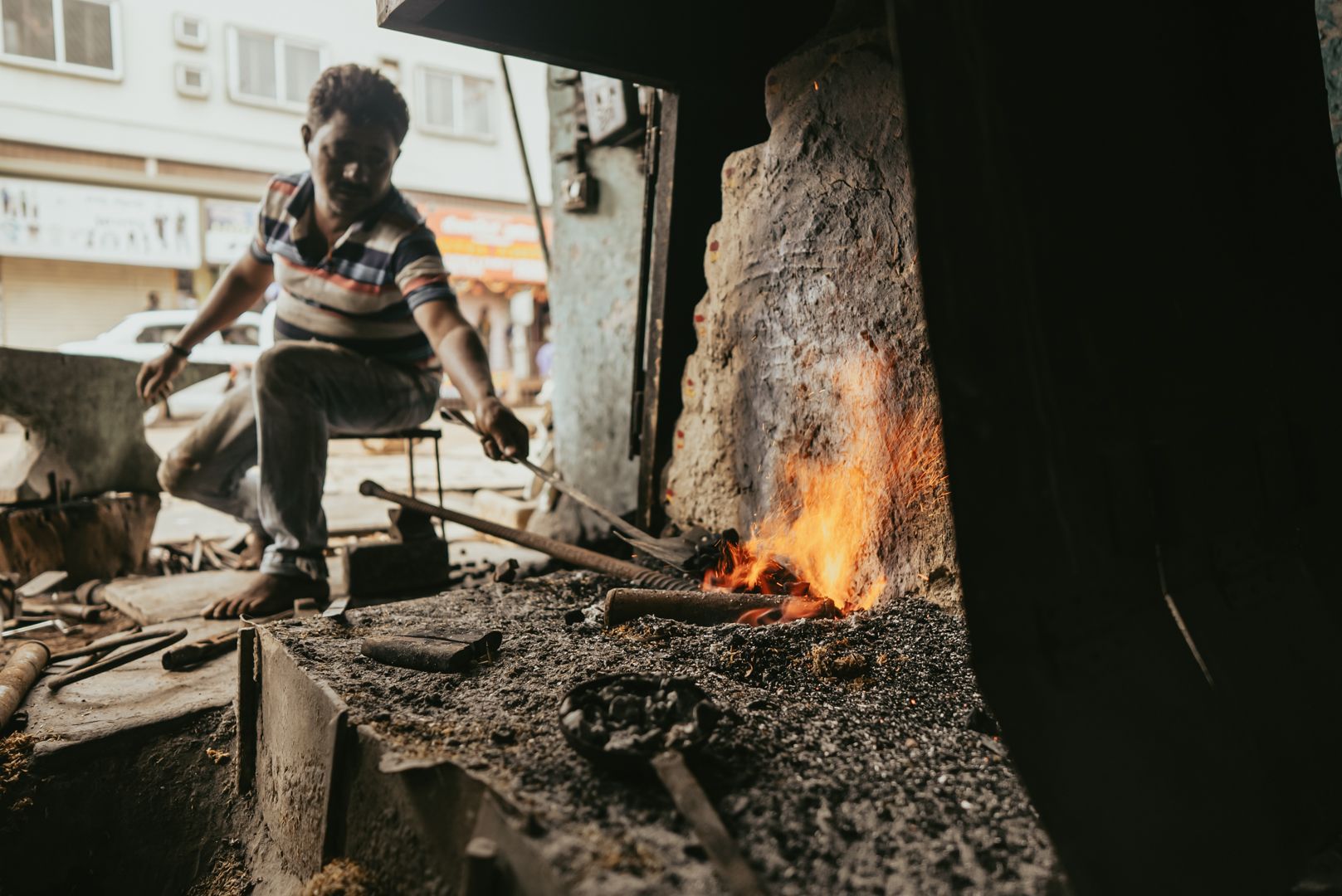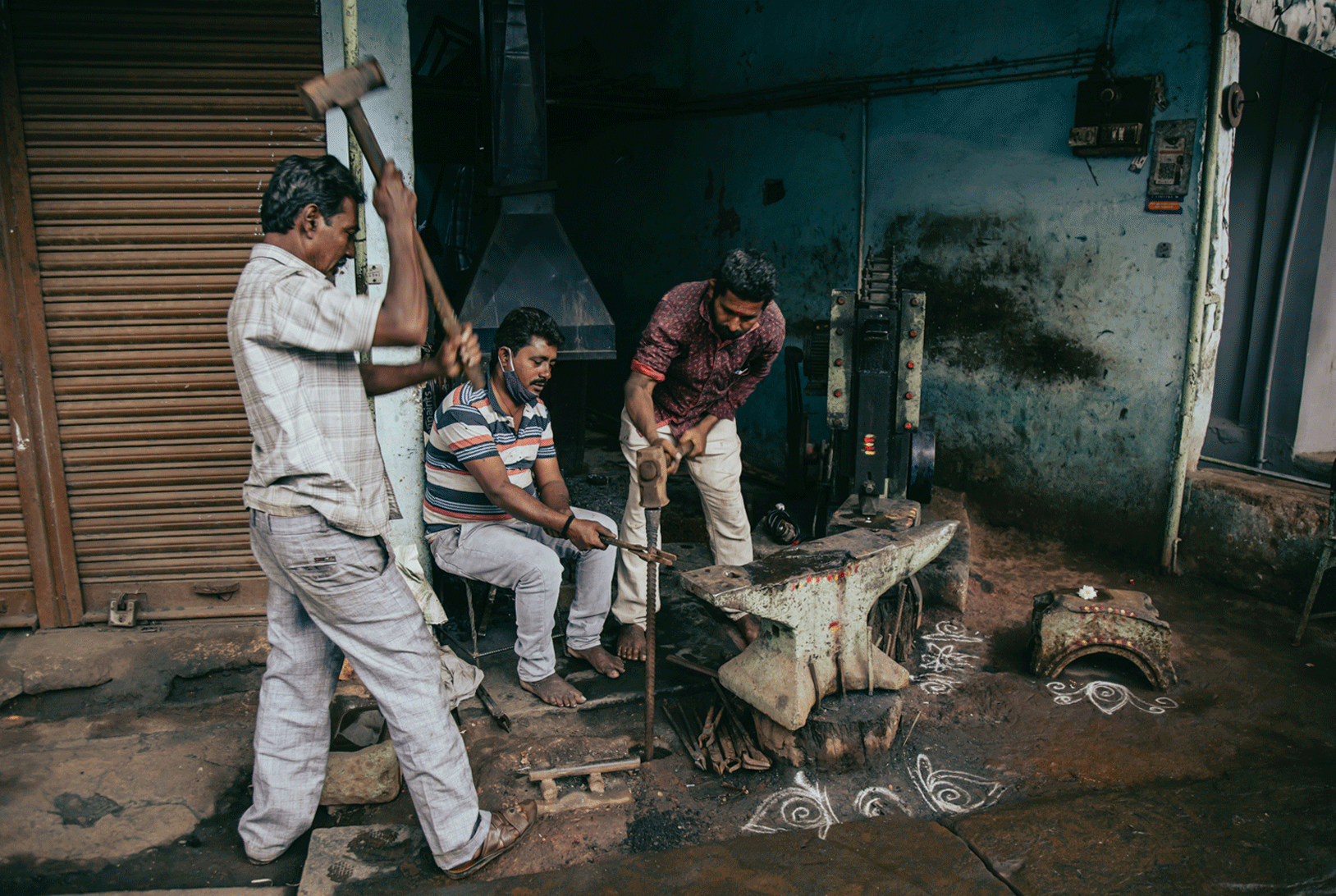 The occupational hazards of blacksmithing manifest as physical discomfort and stress on a daily basis, to occasional injuries and possible permanent damage of many kinds. Mr Pawar suffers from limited hearing due to the hammering machine. Breathing difficulties and body aches are common. Regular anti tetanus injections are taken to prevent septic from the exposure or wounds caused by fine iron pieces. The flame is covered by moistened rice husk to heat the iron faster and equally, and also reduce the smoke produced. Yet, the frequency of complaints from neighbors about high levels of smoke in the vicinity compelled the blacksmiths to construct chimneys for its diversion.
