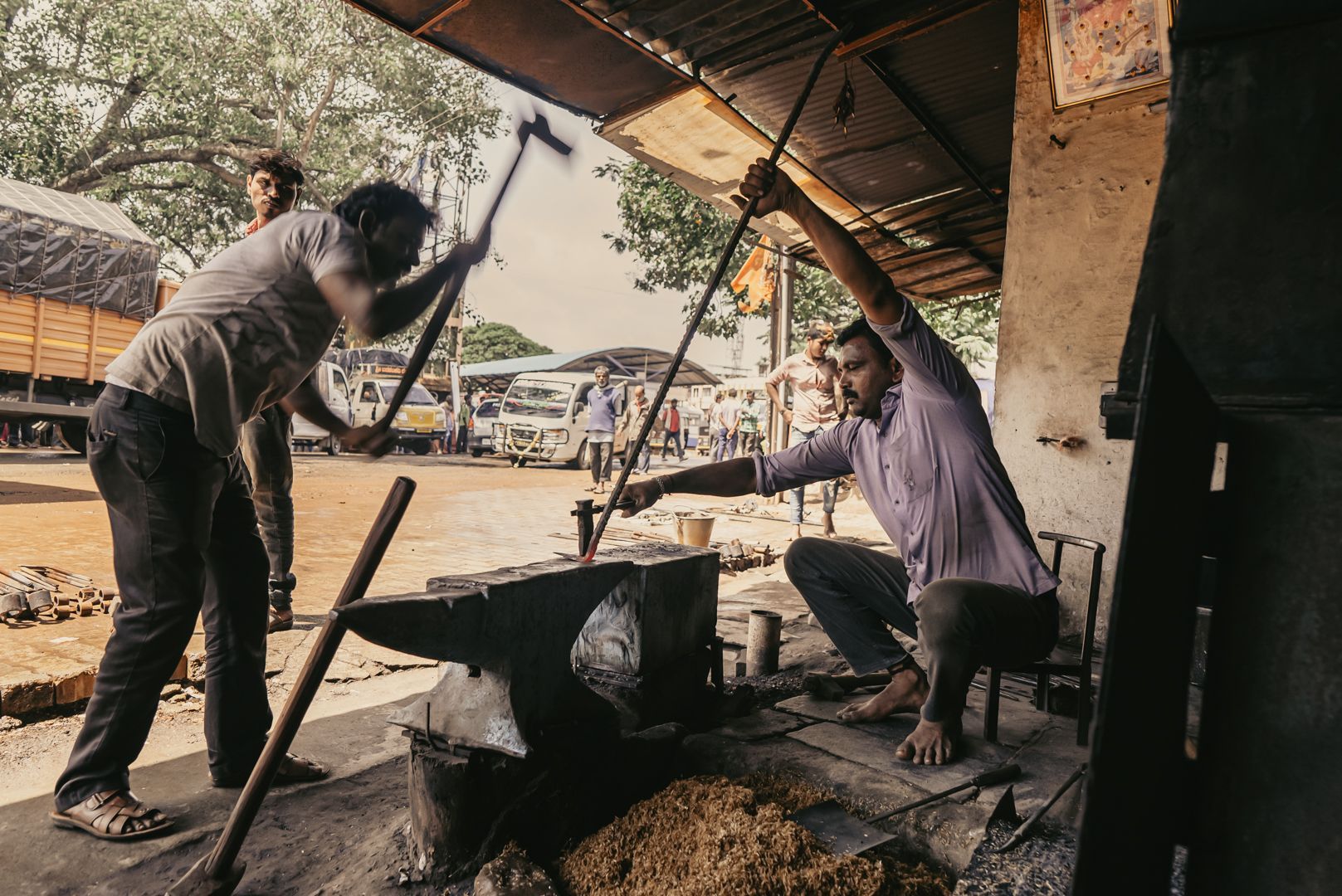 In the heart of Dharwad's business district is a blacksmith cluster that is a hub of tool making. Their key markets are the agricultural (implements like shovels, machetes) and construction (scaffolding, centring) industries. Farmers from villages as far as 20-30 km away travel to this location to place orders, and wait until the tool is ready to be carried back. This clientele makes the kharif and rabi seasons vital to the blacksmiths. Hence the proximity of the blacksmith cluster to the City Bus Terminus (CBT) makes it accessible and well connected.